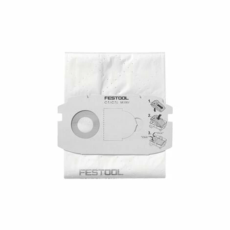Festool SC-FIS-MINI/5x Filter Bags – 498410 – PACK OF 5 These filter bags will fit Festool CT MINI Dust Extractor High-quality cloth filter bag Cleans dust deposits inside the filter bag automatically optimum usage of filter bag volume and constantly high suction power thanks to SELFCLEAN filter bag